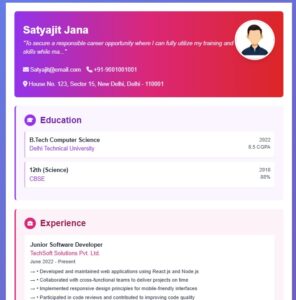Whether you’re a fresher starting your career journey or a professional updating your resume, our free online resume/CV builder helps you create a polished, job-ready resume in minutes. No complicated tools. No signup hassles. Just fill, preview, and download.